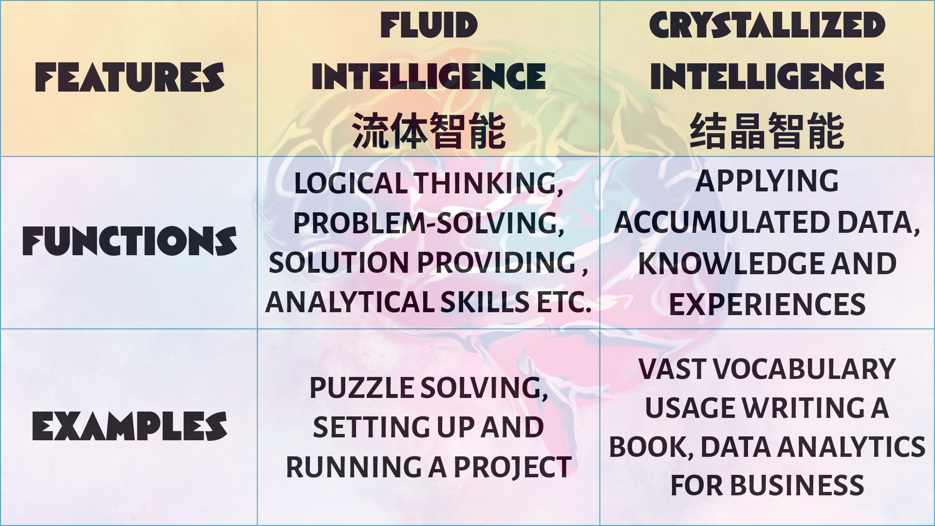 Next, we shall talk about what intelligence is and what it consists of. We need to break it down into two main categories which are “Fluid Intelligence” and “Crystallized Intelligence”. Fluid intelligence will be things like problem solving abilities and logical thinking. On the other hand, crystallized intelligence will be the ability to accumulate and utilize knowledge and experiences of which the example will be one’s written or language skill with vast vocabulary usage. Or the ability to have a wide general knowledge of world events, affairs and cultural knowledge of different countries.